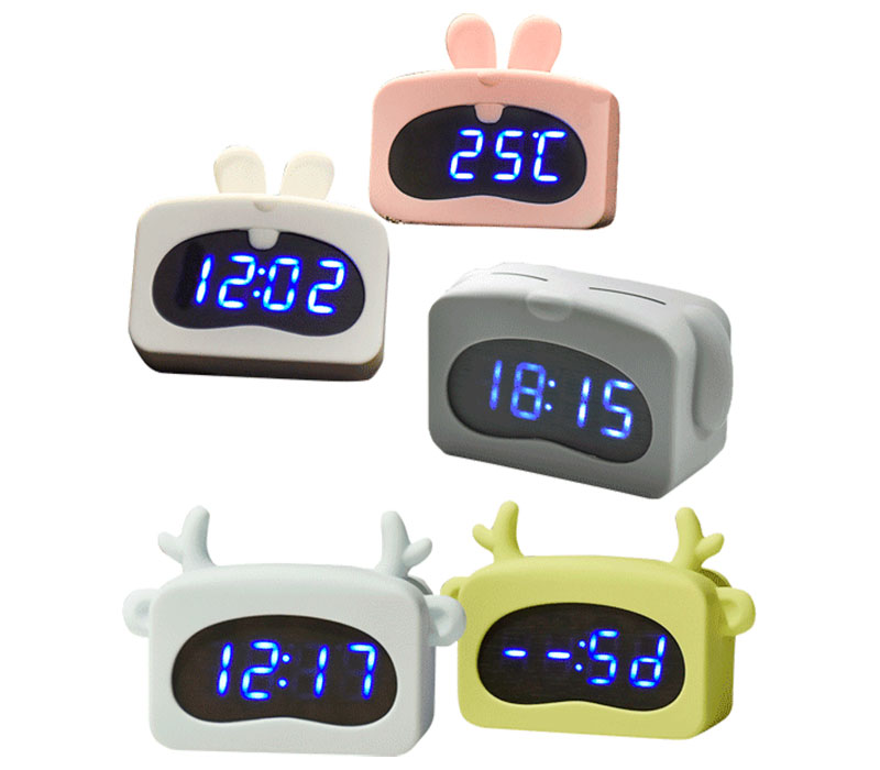 Часы-будильник "deVENTE. Зверята" детские, настольные, корпус из ABS-пластика с силиконовым покрытием, на 4 батарейкаx AAA (в комплект не входят), светодиодный экран с возможностью отображения даты и температуры, в комплекте с USB кабелем, 3 модели корпуса, каждая - в 2 цветах (кролик - белый и розовый, собака - голубая и серая, олень - ярко-салатовый и голубой), в картонной коробке