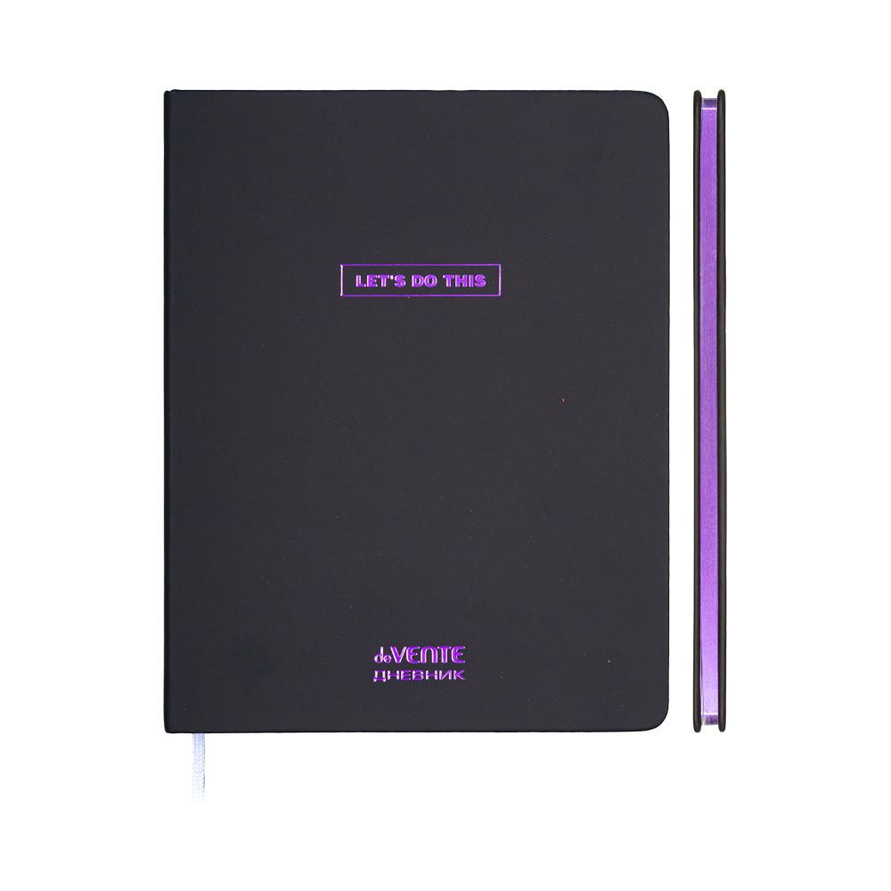 Дневник "deVENTE. Black&Metallic" универсальный блок, 48 листов, белая бумага 80 г/м² с сиреневым металлическим срезом, печать в 1 краску, твердая обложка из искусственной кожи, тиснение фольгой, 1 ляссе, черный с сиреневым металликом