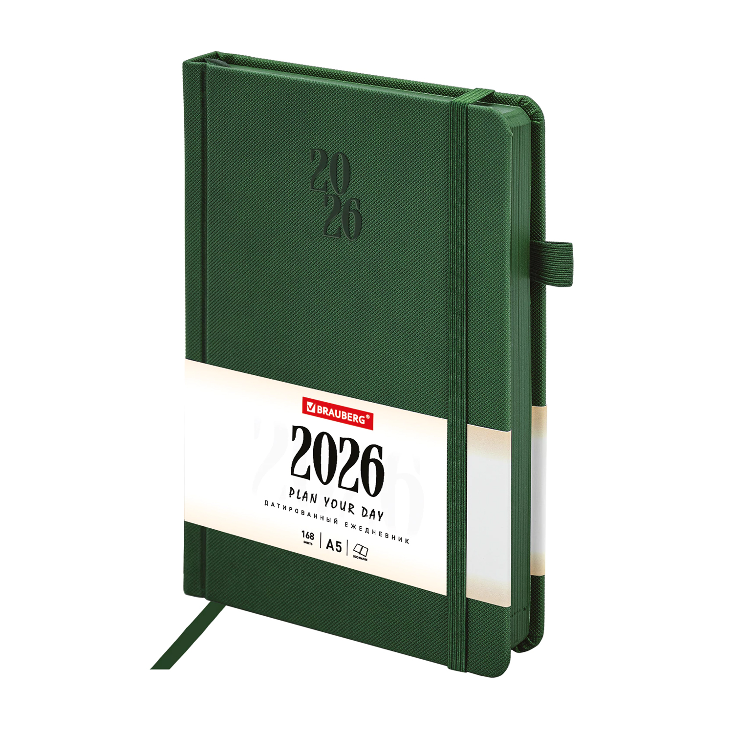 Код товара: 00-00103361Ежедневник 2026г А5 138*213мм 168л Brauberg 117507 Plain под кожу, с резинкой, т-зеленый