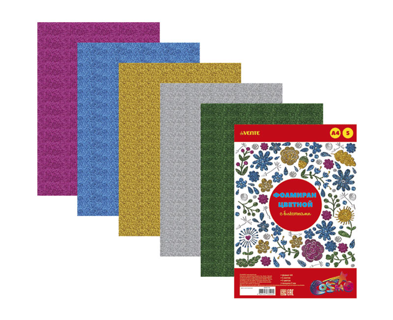 Код товара: 64198Набор фоамирана цветного А4 5л 5цв deVENTE 8040779 с блестками, толщина 2мм