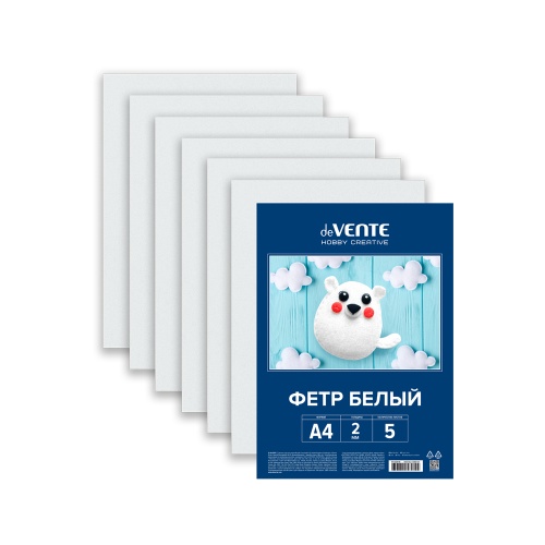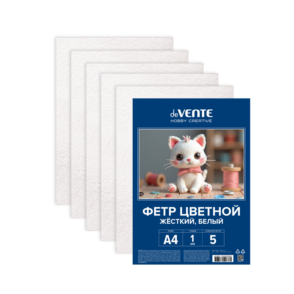Код товара: 00-00097023Набор фетра цветного жесткого А4 5л. 1цв deVENTE 8113413 белый толщина 1мм