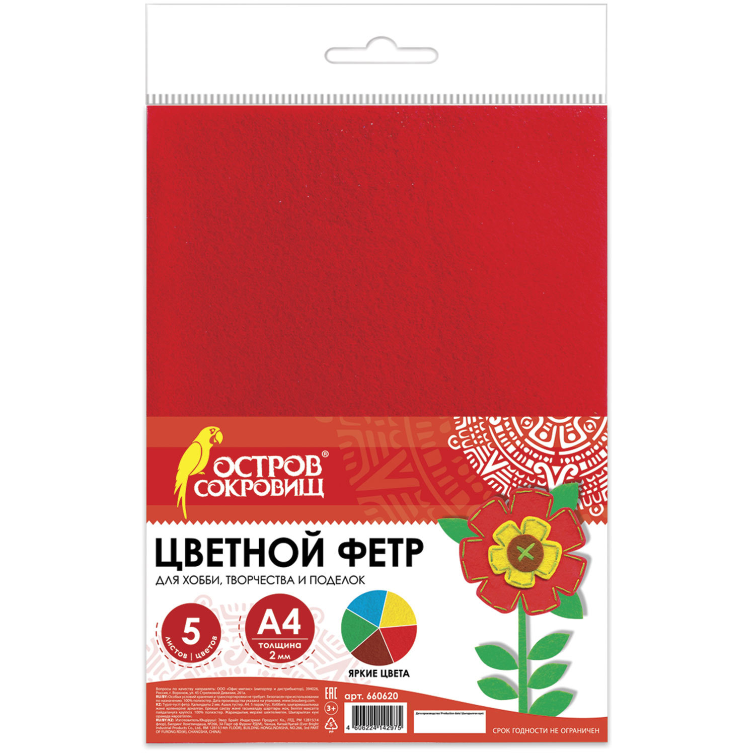 Код товара: 00-00068187Набор фетра цветного А4 5л 5цв Остров Сокровищ 660620 толщина 2мм