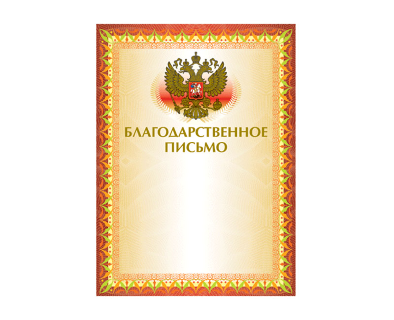 Благодарственное письмо с изображением российской символики. Характеристики Формат А4. Импортный мелованный картон, плотность - 230 г/м2. Надписи - конгревное тиснение фольгой.