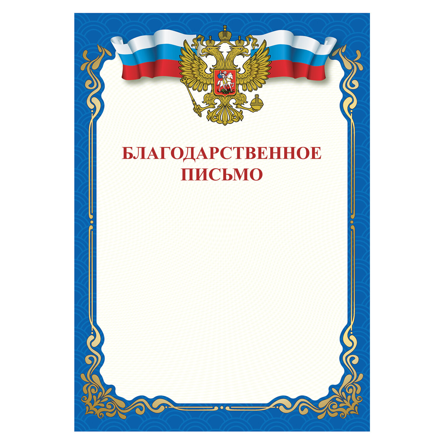Грамота "Благодарственное письмо" с изображением российской символики. Изготовлена из импортной мелованной бумаги плотностью 115 г/м2. Составляется в свободной форме. Имеется изображение российской символики. Формат А4.