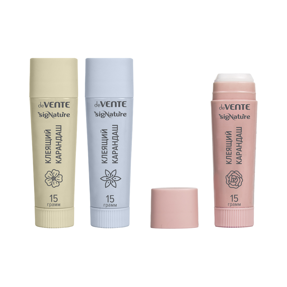 Клеящий карандаш PVP основа "deVENTE. sigNATURE" 15 г, высокой вязкости, в картонном дисплее с пластиковым поддоном, ассорти 3 цвета корпуса