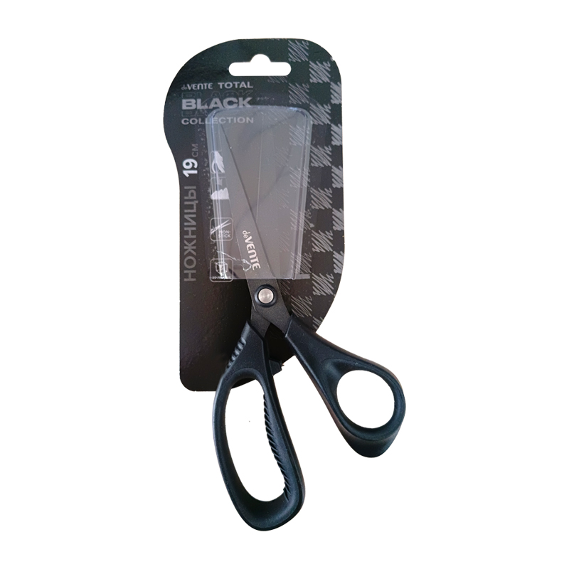 Ножницы канцелярские "deVENTE. TOTAL BLACK" 19 см, черные прорезиненные кольца с лепестками, 3D лезвия, тефлоновое покрытие лезвий, в картонном блистере