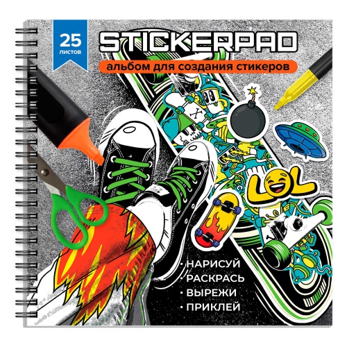 Код товара: 00-00115361Альбом для создания стикеров 195*195мм 25л на спирали, 65830 Яркий скейтборд