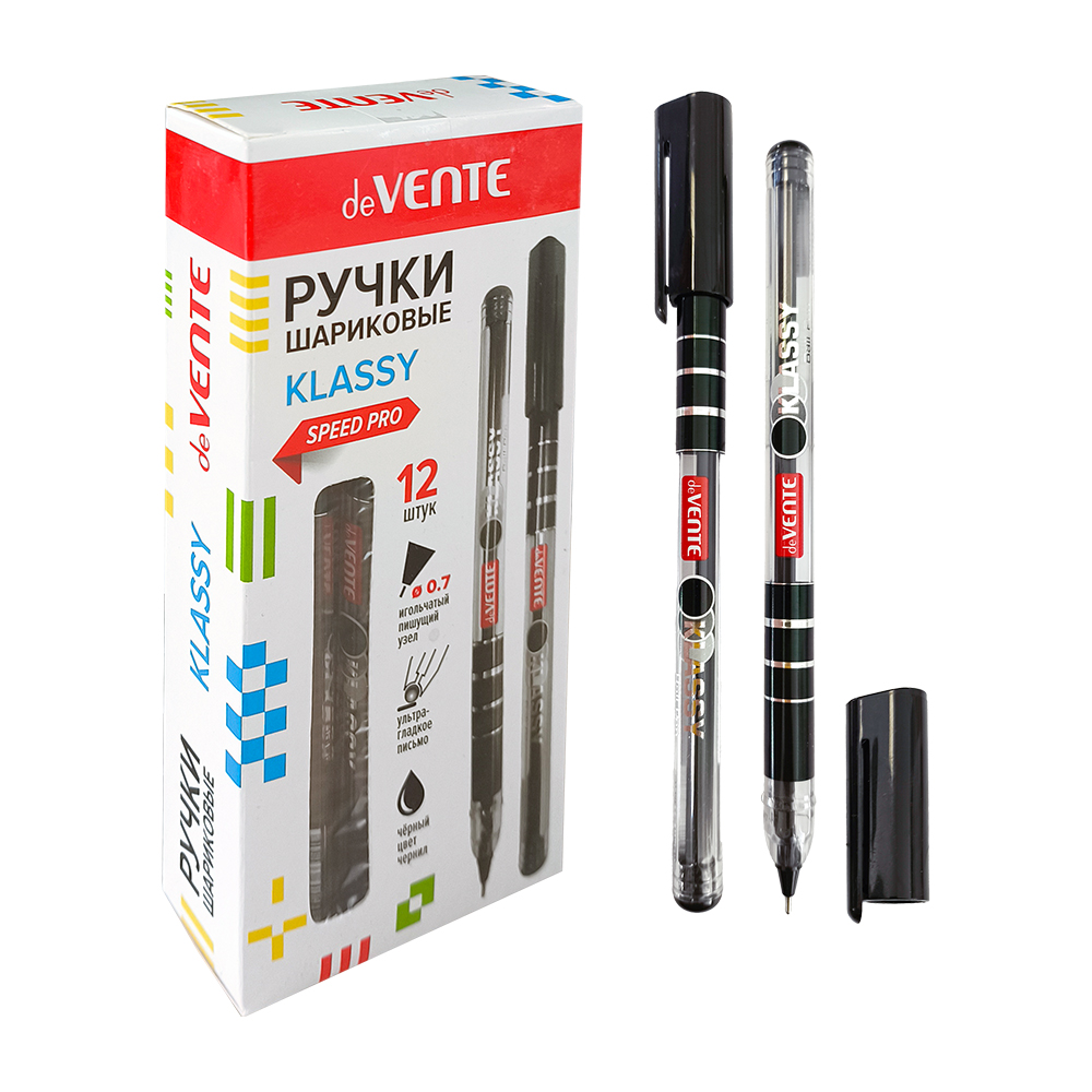 Ручка шариковая "deVente. Klassy" серия Speed Pro, d=0,7 мм, ультра гладкое письмо, чернила на масляной основе, игольчатый пишущий узел, полупрозрачный корпус с цветным дизайном, одноразовая, индивидуальная маркировка, чёрная, в картонной коробке.