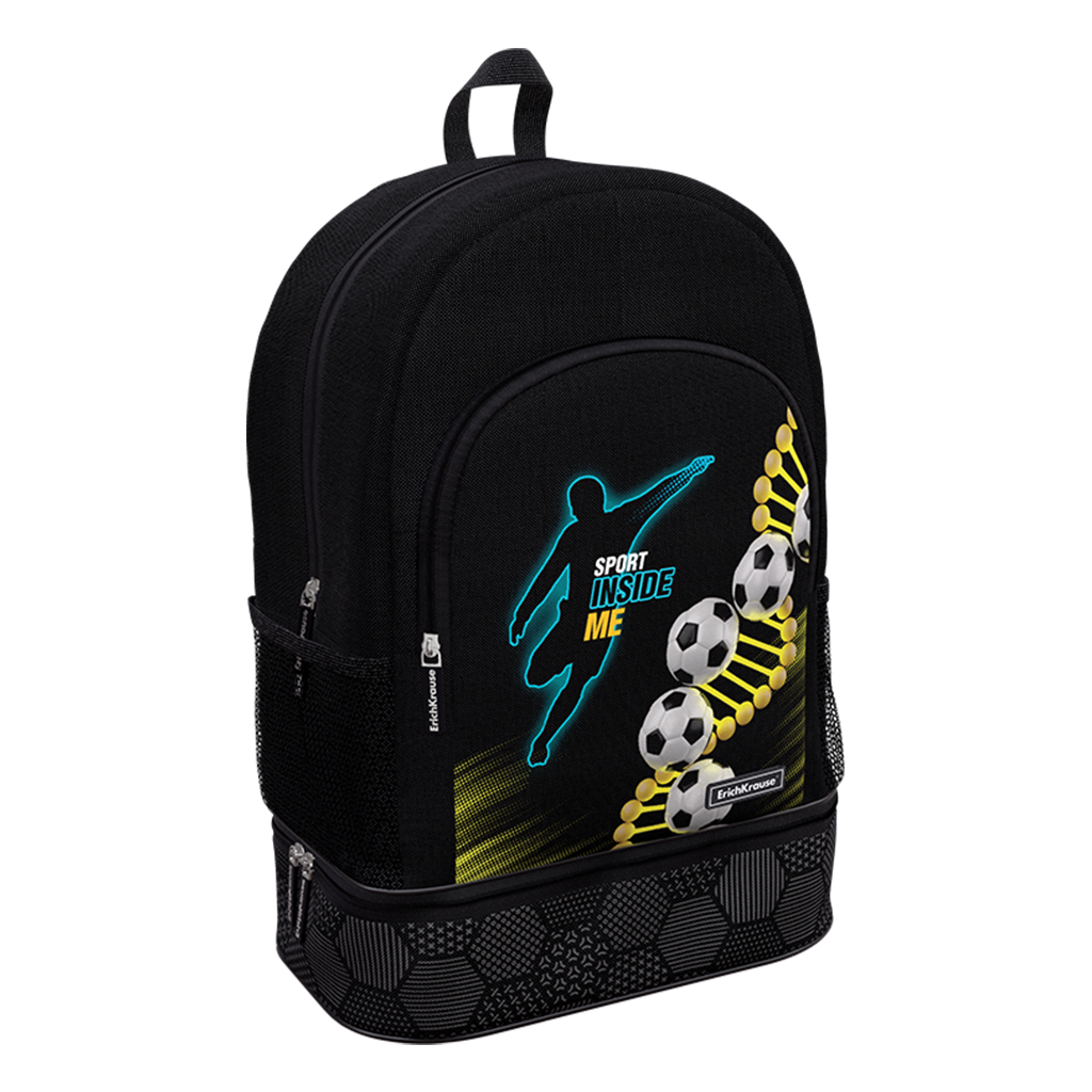 Модель ActiveLine BootsBag размером 44х30х17 см и объёмом 21 л изготовлена из износостойкого и водоотталкивающего полиэстера 600D. Внутри отделение формата А4, карман из сетки, сетчатый мини-органайзер и карман на молнии. Эти отсеки позволяют аккуратно разложить внутри различные аксессуары и другие личные вещи. Снаружи имеется большой фронтальный карман на молнии, а также пара боковых сетчатых карманов для вещей средних размеров, таких, как бутылка с водой. Отличительная особенность модели – специальный встроенный отсек для обуви. Это практично для школьных или спортивных занятий: сменную обувь можно положить прямо в рюкзак, нет необходимости в отдельном мешке. Технология AirMesh, использованная на спинке, делает рюкзак комфортным и “дышащим”. Крепления лямок усилены дополнительным швами, что добавляет прочности, а механизм молний плавный и надёжный.